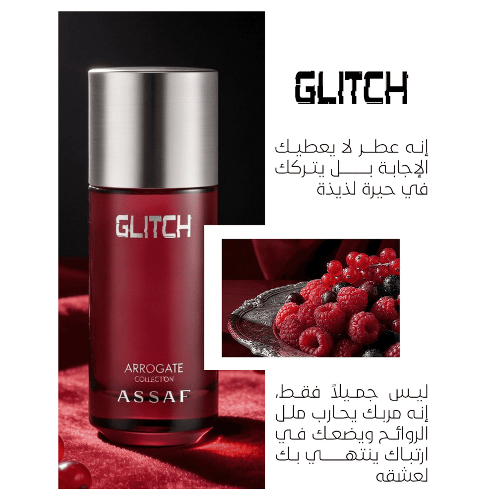Glitch Assaf عطر زهري - فواكه للجنسين. هذا عطر جديد Glitch صدر عام 2026. Glitch من توقيع Quentin Bisch و Louise Turner. إفتتاحية العطر توت العليق و الجريب فروت; قلب العطر نجيل الهند و زهر البرتقال; قاعدة العطر تتكون من الأمبروكسان و الفانيليا.